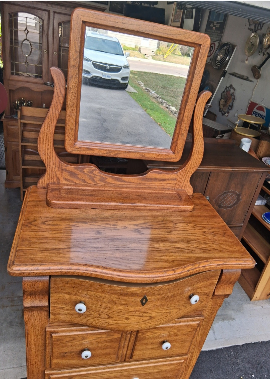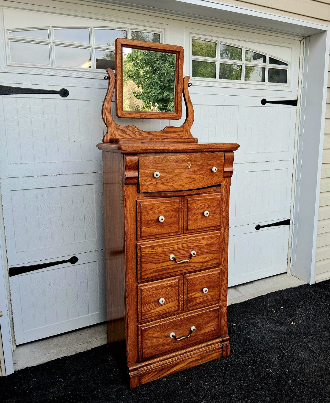 This is a great dresser for small spaces! Canadian made Kaufman of Collingwood oak highboy with swing mirror. Only 28" wide. Approximately 73" tall to top of mirror.