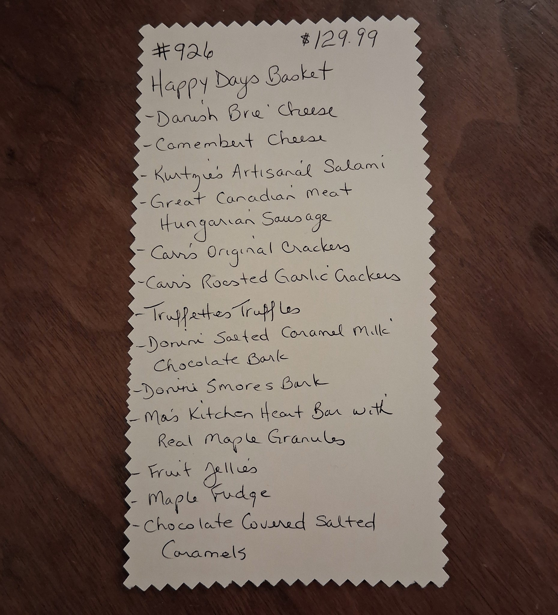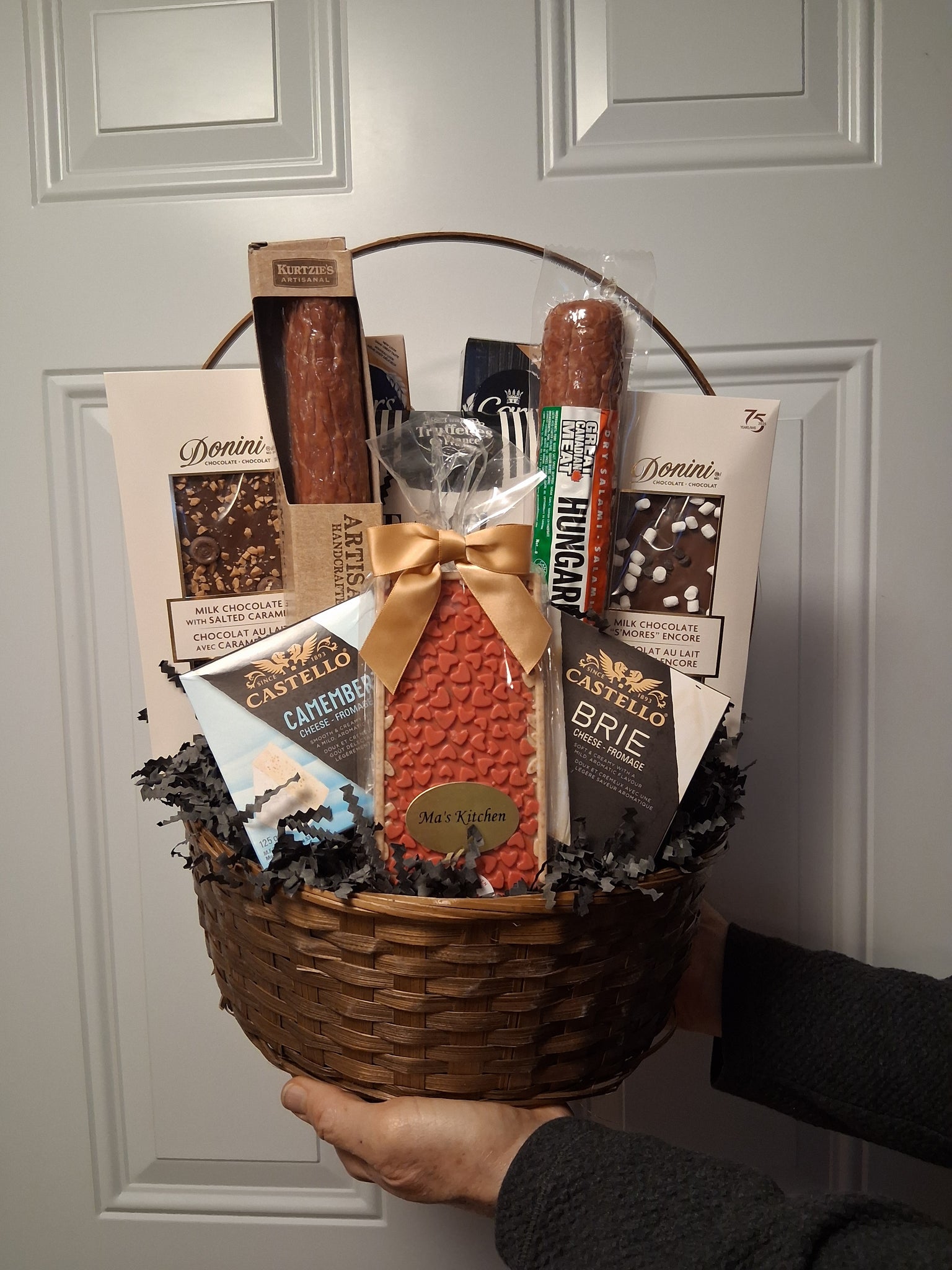 For full list of contents, see second photo. It is dressed up with a large bow with holly & berries!