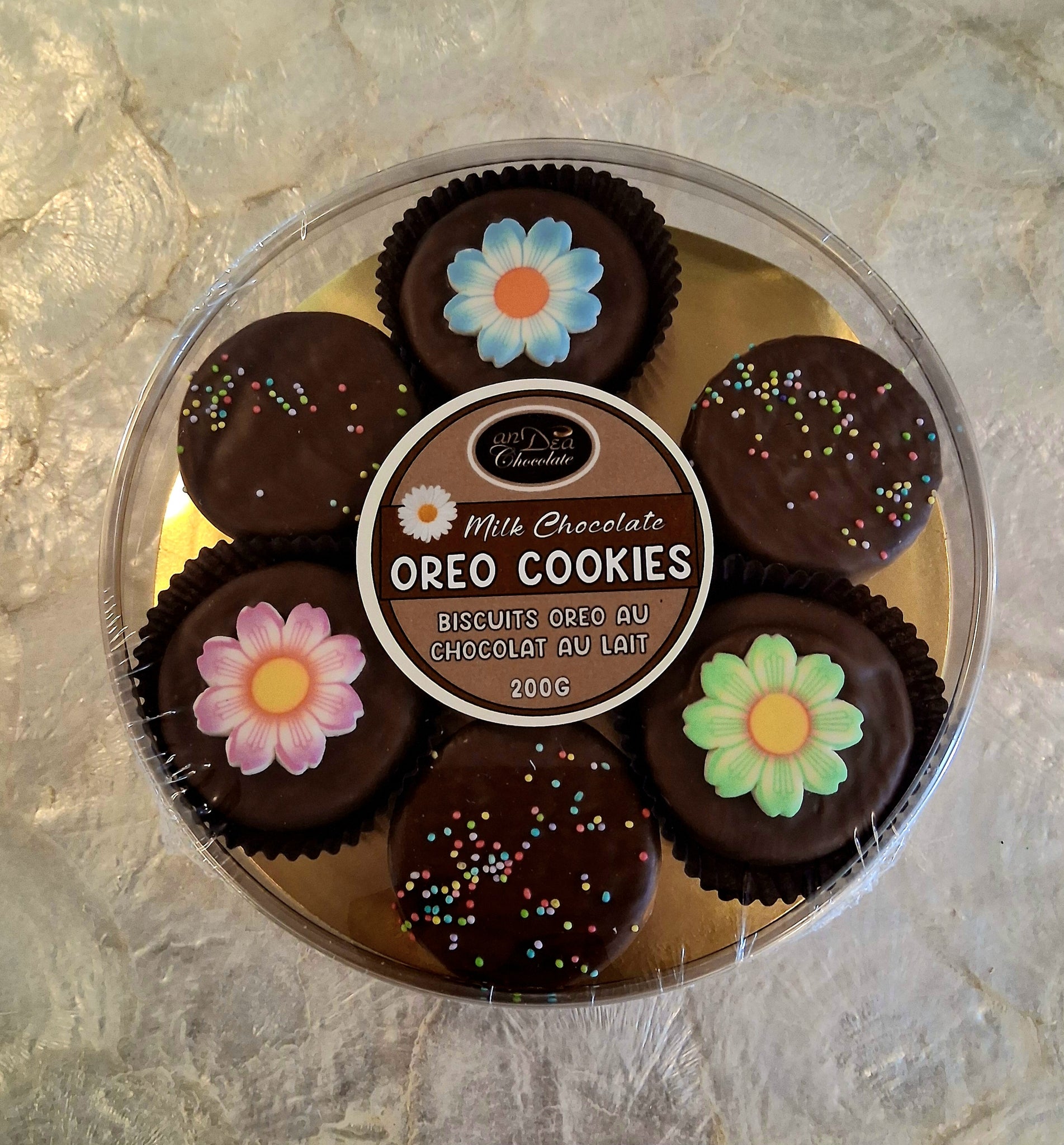 Andea Milk Chocolate Covered Oreos decorated for the holidays. Round gift box contains 7 oreos. (Flower version is now sold out.)