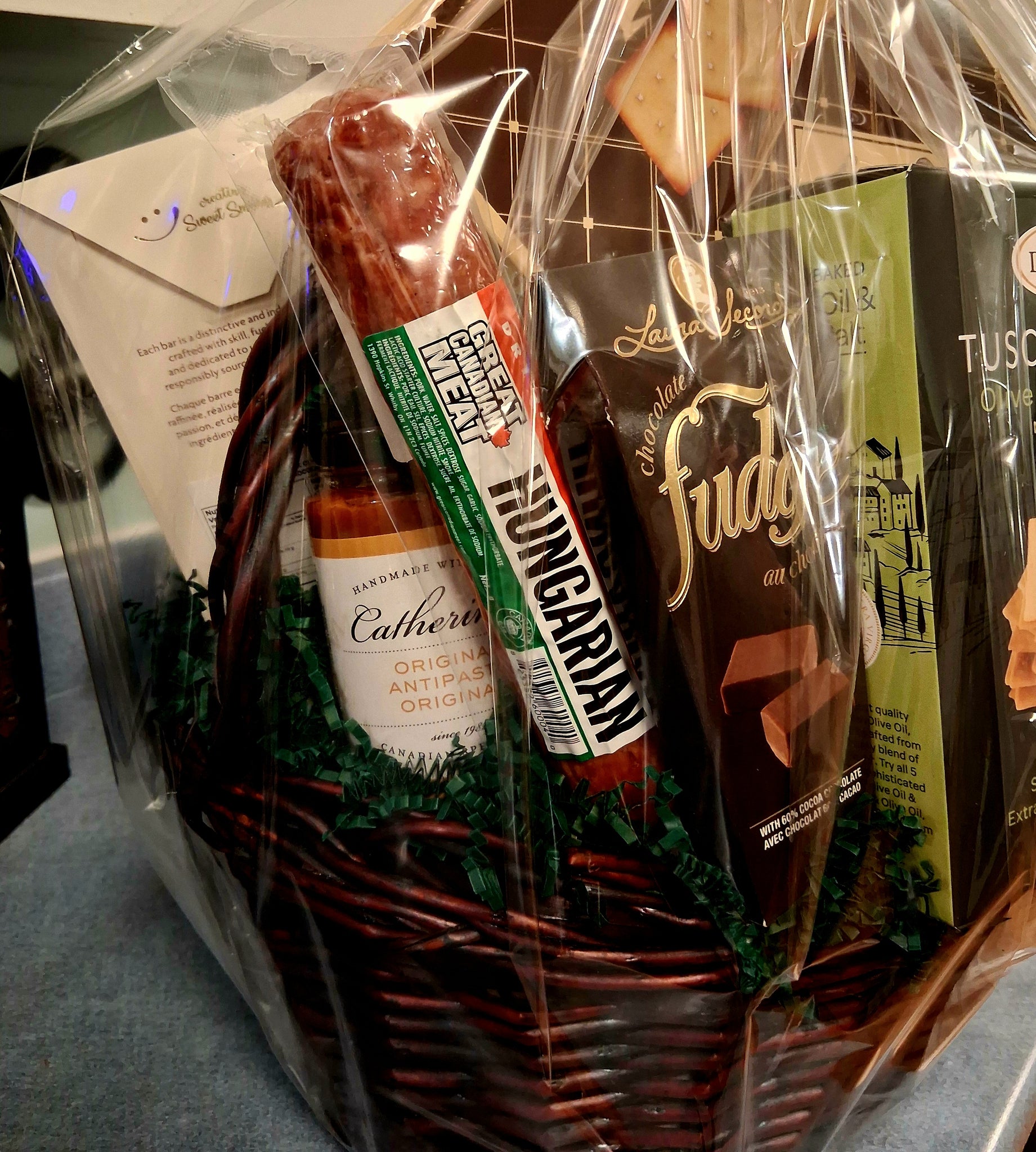 This extra large gift basket includes: an assorted box of 15 Rogers' Chocolates, Brie Cheese, Great Canadian Meat Hungarian Sausage, Great Canadian Meat Pizza Style Sausage, Tuscan Crisps Crackers, Mixed Nuts, Catherine's Pepper Jelly, Catherine's Antipasto (no tuna), Donini Salted Caramel Milk Chocolate, Donini Smores Milk Chocolate, Gourmet Pretzel with Chocolate & Toffee, 2 Ghirardelli Chocolate Mint Squares, Crispy Sugar Cookies, Laura Secord Chocolate Fudge, and Canada True Maple Fudge.