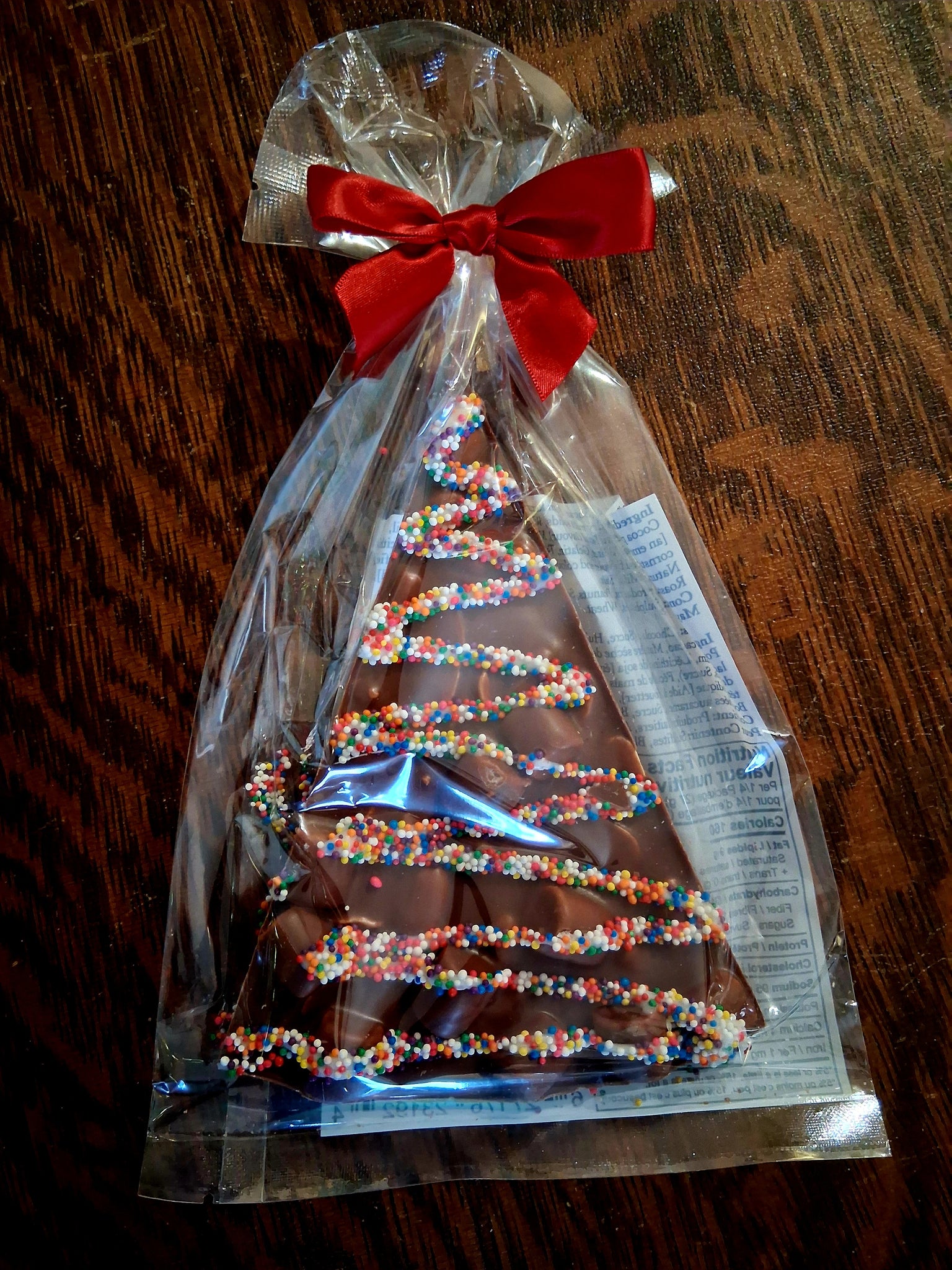 Marshmallows, peanuts, roasted almonds, toffee bits & milk chocolate shaped like a Christmas Tree.