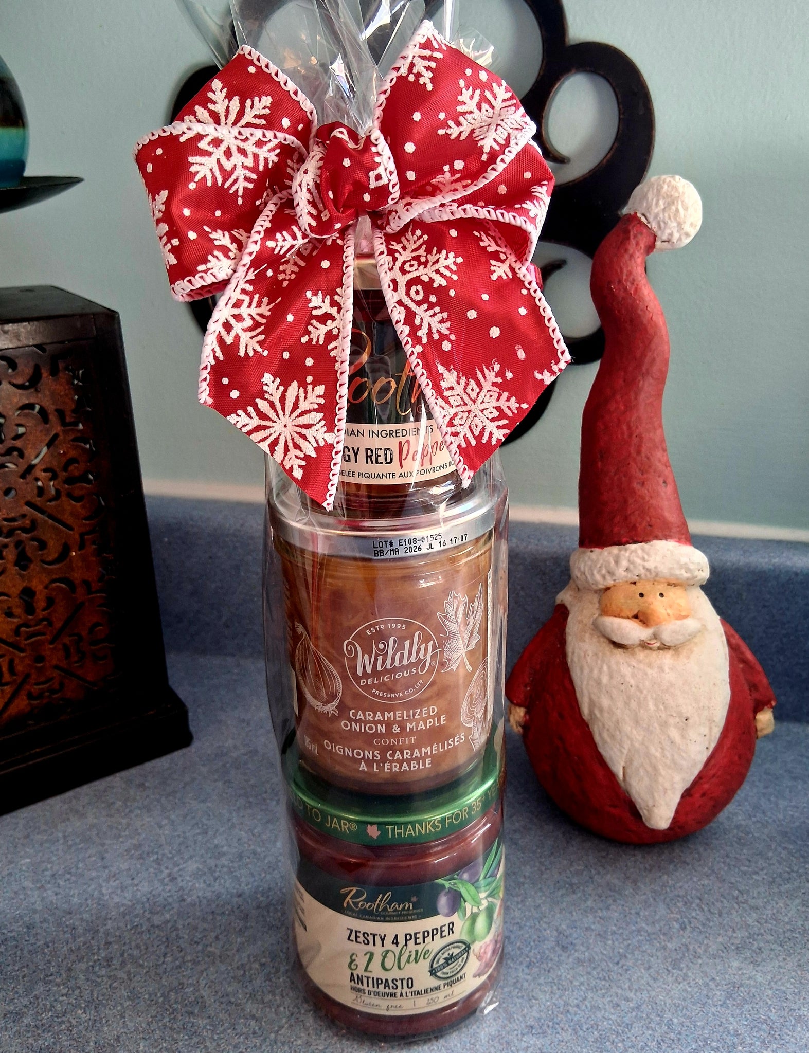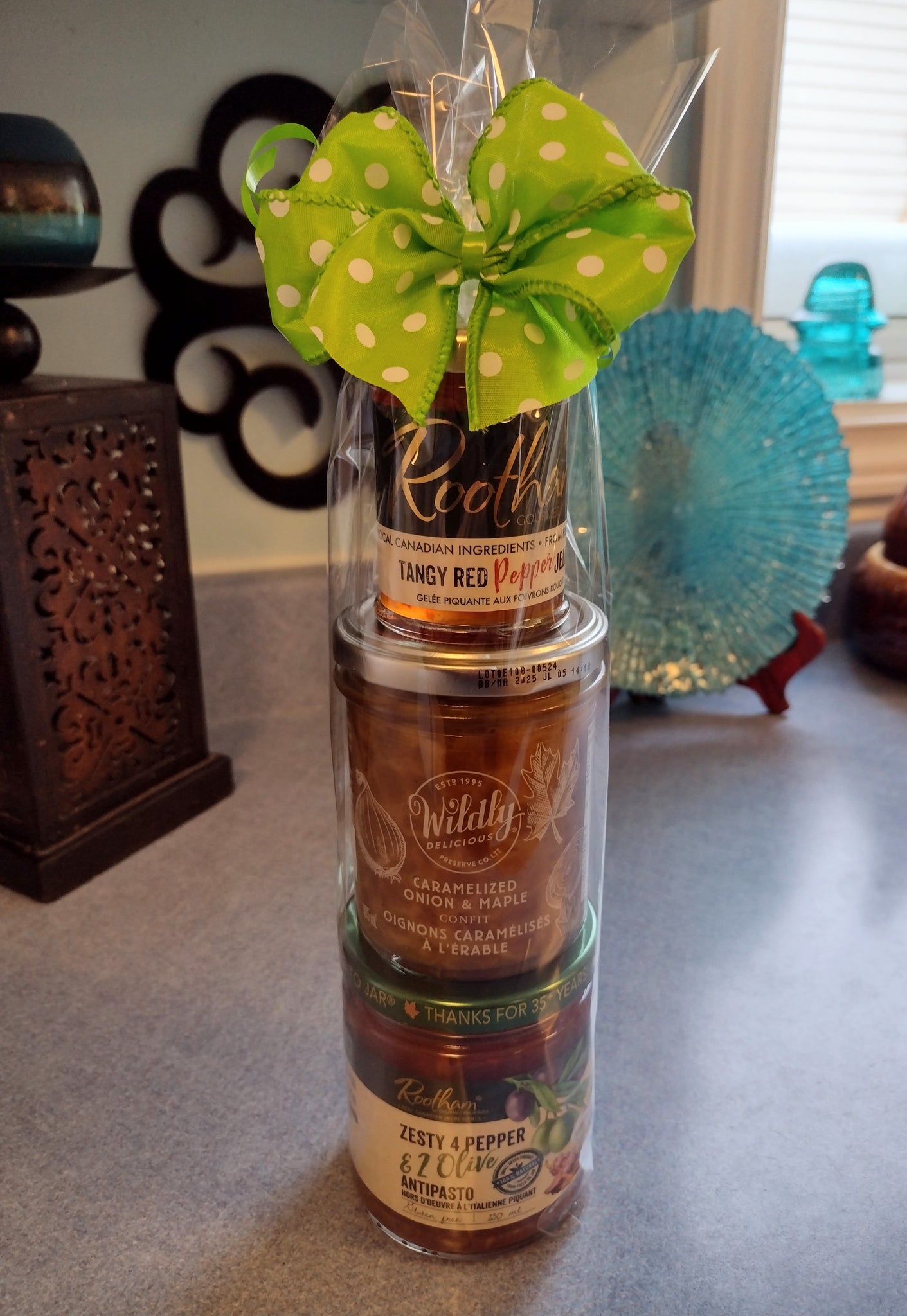 Rootham Red Pepper Jelly, Wildly Delicious Caramelized Onion & Maple Confit (amazing!), and Rootham 4 Pepper & 2 Olive Antipasto. * Also available with 2 or 3 jam choices.